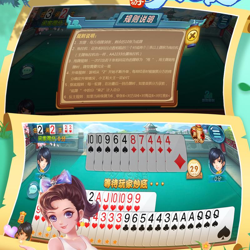 发牌:系统随机指定发牌人,按顺序发牌。庄家扣好底牌后,其他人可用王和叫主牌对子再扣底,增添游戏趣味性与庄家风险性。